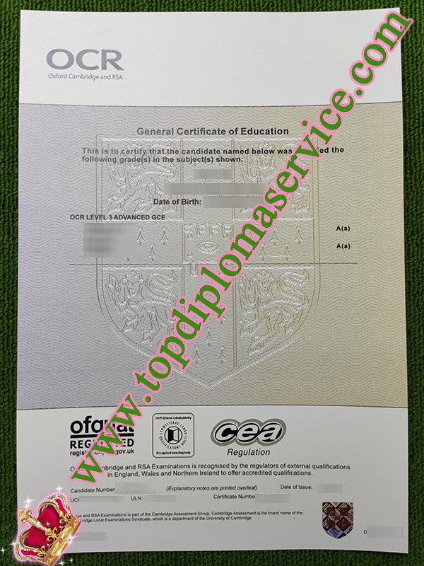 OCR (Oxford, Cambridge and RSA Examinations) is an examination board that sets examinations and awards qualifications (including NVQs, SVQs, GCSEs and A-levels). It is one of England, Wales and Northern Ireland's five main examination boards and offers over 450 vocational qualifications. How can i buy a fake OCR certificate, buy OCR General certificate of education, fake OCR GCE certificate, make fake A level certificate.